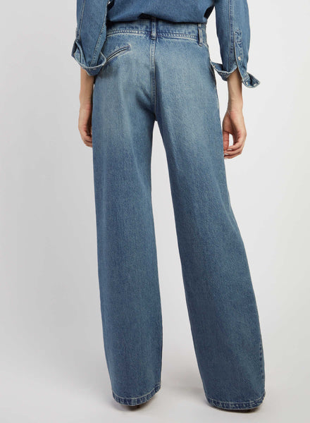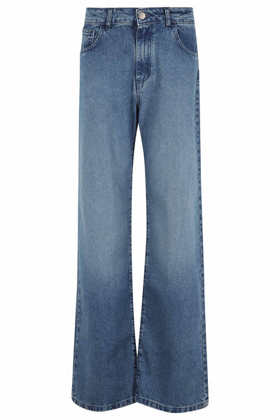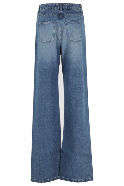 Jeans donna doppio cinto a vita alta, gamba dritta e lavaggio blu medio. Linea di design e vestibilità pulita, ideale per un look moda. Made in Italy