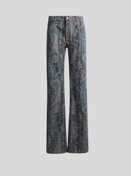Jeans con gamba svasata realizzati in denim di puro cotone con un motivo Paisley floreale multicolore all over. Il modello cinque tasche è rifinito da una salpa posteriore con Pegaso e logo ETRO.• Vestibilità regular• Modello a cinque tasche• Chiusura con bottone Pegaso e cerniera nascosta• Salpa posteriore con logo ETRO e Pegaso• Made in Albania• La modella è alta 176 cm e indossa una taglia 26